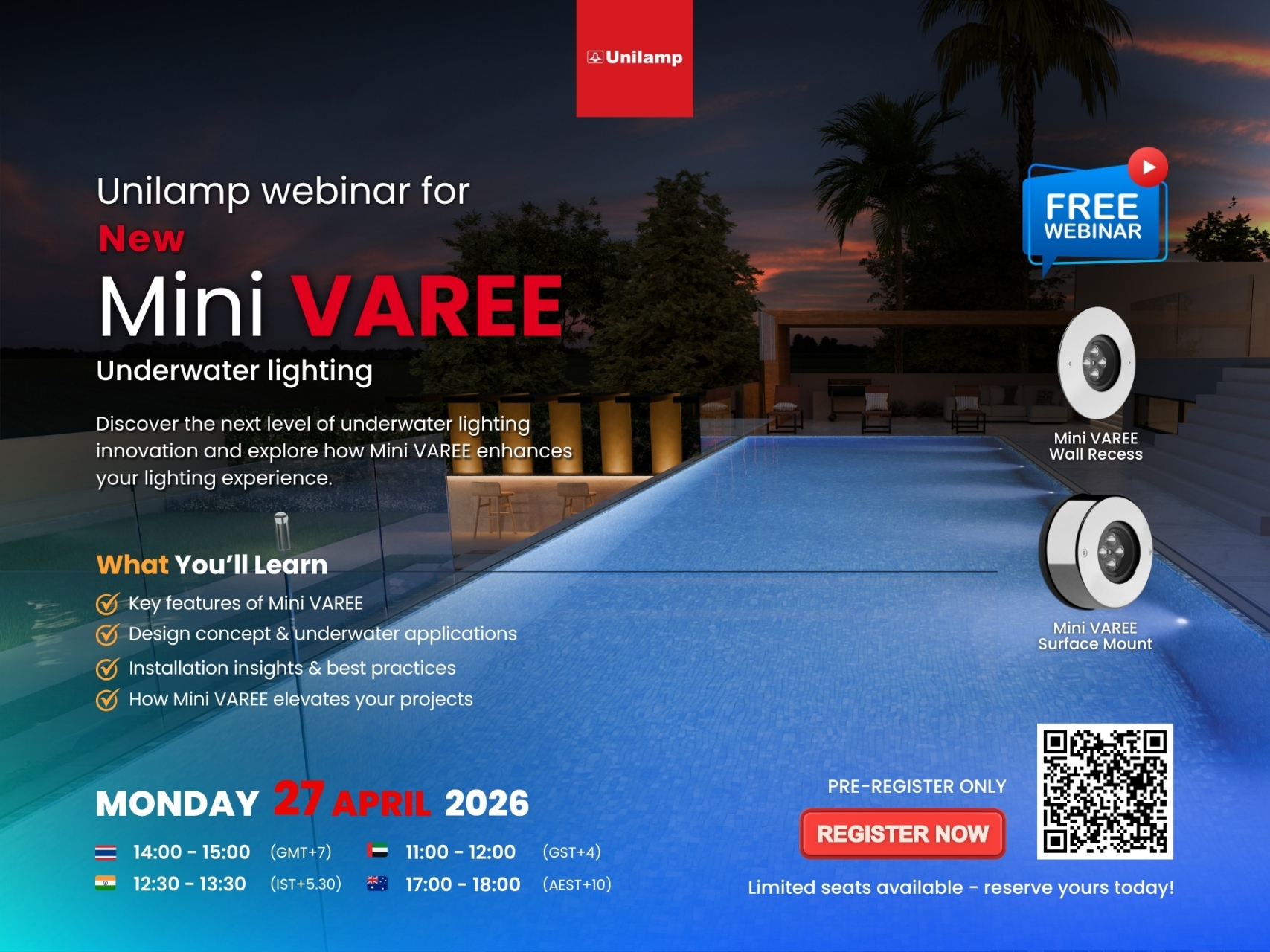 Unilamp is pleased to introduce an upcoming product training webinar featuring its latest underwater lighting innovation, Mini VAREE. This free online session is designed for lighting professionals, designers, and Unilamp partners who are looking to enhance their knowledge of modern underwater lighting solutions.